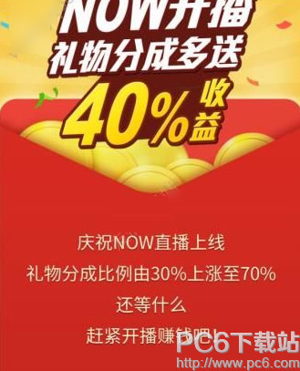 小编在这里要告诉大家的是now直播是直播获得礼物来赚钱的哦,而且现在,为了庆祝now直播上线,礼物分成比例由30%上涨至70%!赶紧来直播赚钱吧!