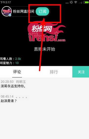 1.打开粉丝网app,进入到直播间中,你可以直接看到直播的标题就是哪位明星的直播内容,点击进入后,直接点击订阅按钮就可以了!