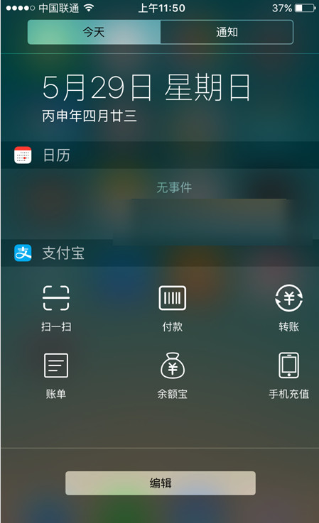 三、最后就可以在在“通知中心”中调出支付宝界面