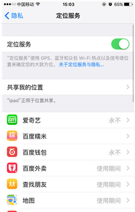 5.设置完成以后,我们再次打开iPhone上的“定位服务”选项,发现已经可以进行手动设置了。