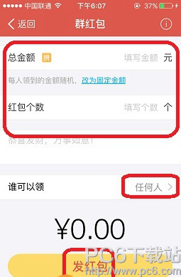 3.接着按照提示输入红包总金额以及红包个数,选择任何人可以领取,点击发红包