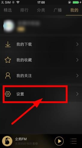 1、首先打开企鹅FM,在我的里找到设置,就是箭头所指的位置,点进去。