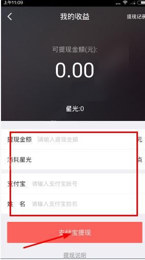 3、在我的收益界面,输入提现金额,消耗星光,输入支付宝账号,姓名,点击支付宝提现按钮就可以了