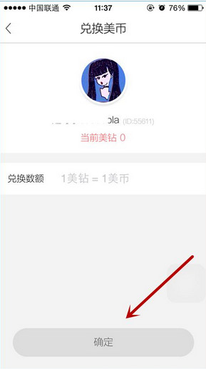2、进入“兑换美币”页面,1美钻等于1美币,兑换比例为1:1,点击下方的“确定”;