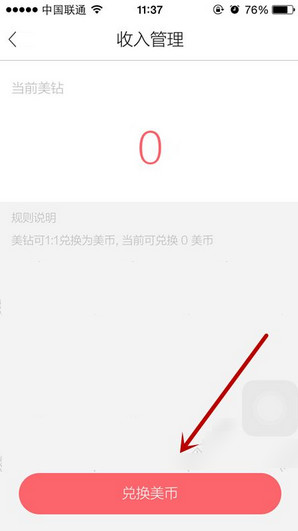 3、在“收入管理”页面你可以查看自己的“当前美钻”,选择要兑换的数额后点击下方的“兑换美币”就可以兑换提现成功了哦!
