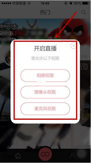 1、打开咪嘻TV,点击下方的“直播”按钮,在弹出的页面中你需要允许相册权限、摄像头权限、麦克风权限,只有开启了这些权限你才能进行直播
