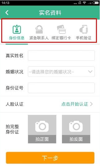 3、然后用户按照步骤完善身份信息,填写紧急联系人、绑定银行卡,进行手机验证,最后等待审核通过后就可以了。