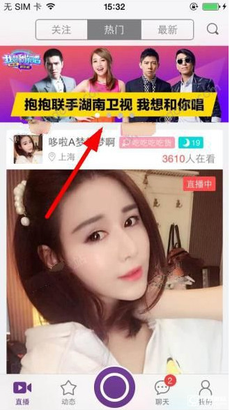 1、首先,打开抱抱直播APP,点击箭头所指的上方抱抱联手湖南卫视,我想和你唱!
