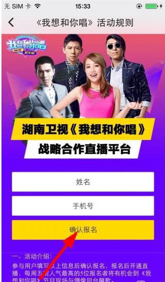 3.参与用户填写以上信息确认报名,报名后开通直播,每周五人气最高的5位报名者将有机会到《我想和你唱》节目现场和偶像同台飙歌!