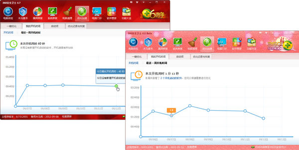 评测机构所说的启动时间,是自按下开机键,到出现选择用户输入密码界面时所用时间。而360安全卫士所检测出的开机时间,是指从按下开机键,到整个桌面准备停当(Win 8传统桌面)、用户可立即工作所用的时间。