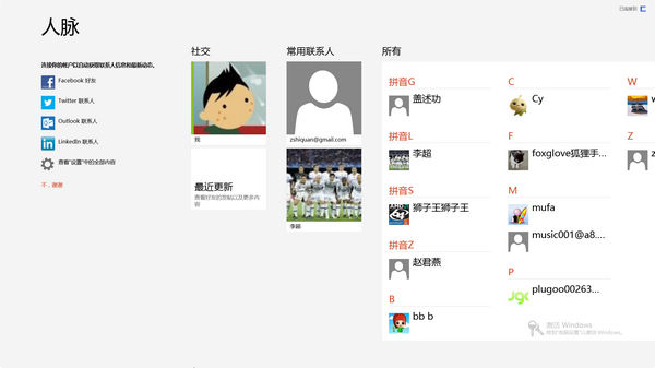 二是“人脉”,通过它,我可以轻松地了解我的Facebook、Twitter、Outlook和LinkedIn中的好友或联系人,是否发布了新的信息(图6)。此外如果需要,我还可以通过单击相应的联系人,快速地给他们发送邮件,或通过MSN给他们发送信息。