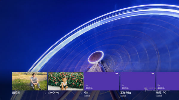 六是“SkyDrive”和“照片”。Win 8风格的“照片”应用,除了可以以幻灯片的方式,依次播放SkyDrive相册和图片库中的图片外,还可以播放位于同一个家庭组用户共享出来的