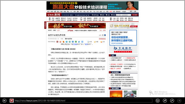 此外,Win 8风格的应用程序默认以全屏模式启动(图10),给人以大气的感觉。对于这一设置我们可以通过鼠标放置窗口左上角点击右键来进行窗口贴靠的更改,这在一定程度上也给了我们阅读的便利,因为这就意味着,我在浏览网页的同时,可以通过QQ和MM聊天,或者在编辑文档时,可以同时打开RSS类阅读器参考其中的资料内容。