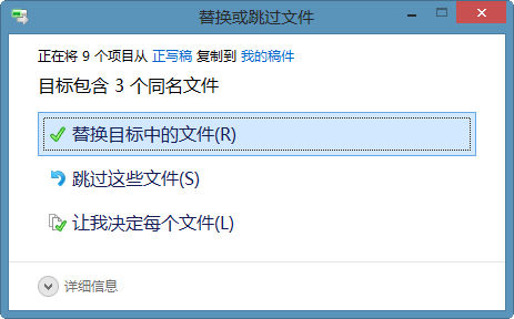 一是重复文件复制提醒。复制文件时,Win 8会根据文件名、文件大小,修改日期等属性,来确定目标路径中是否存在重复文件。如果有,会弹出一个“替换或跳过文件”对话框,让我自行选择要保留哪个文件,如果我确定要保留所有的原文件,可以直接选择“跳过这些文件”项,自动跳过那些分明是同一文件的文件,而继续按照指令复制其它文件(图19)。