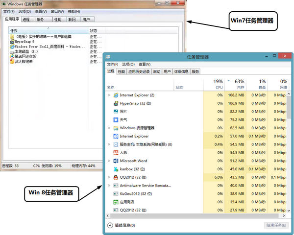 一是显示的信息更加细腻,对于64位的Windows8系统,当使用32位程序时,会在程序后面予以标注。而当某程序没有响应时,新版本的管理器会以醒目的红色字样予以提示;