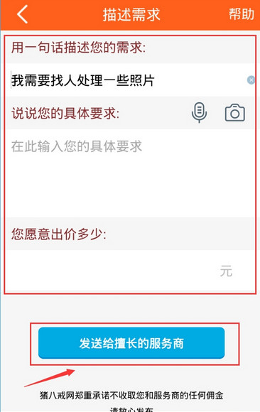 3、选择好子分类之后,进入“描述需求”页面,在输入框内输入你的具体要求,同时你也可以选择语音和相机按钮来插入语音和图片,最后将报价填写在下方并提交。