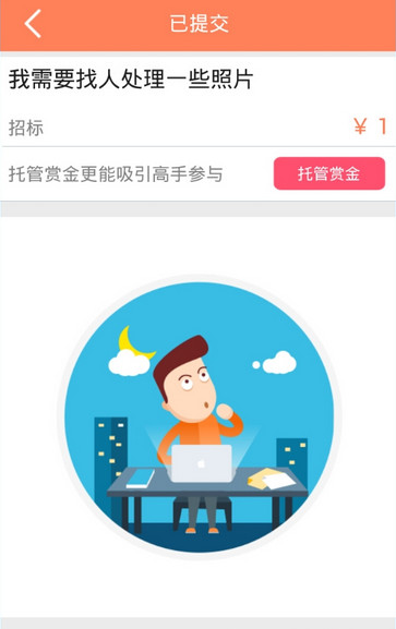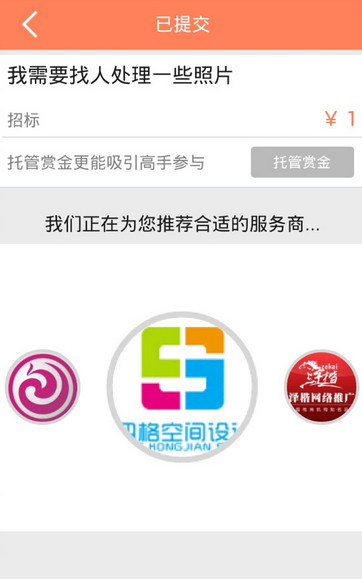 4、提交后,系统将为你自动推荐商家,你可以联系或雇佣他们。你也可以直接托管赏金到猪八戒,付款后直接等待商家回应!收货满意后再放款。
