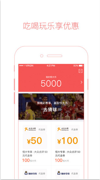 扫码赢币-扫描恒大冰泉二维码,赢取恒大币。兑换券码-兑换多种电子券,格瓦拉、Uber、大众点评,互动猜球-玩虚拟足彩,赚更多恒大币。