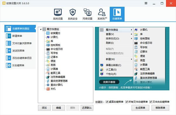 除此之外,使用中的魔方设置大师,即可一键把喜欢的系统组件、第三方应用程序加入系统右键菜单,例如“魔方快捷组”,完美支持32位和64位的Win8.1、Win8、Win7、Vista等系统。