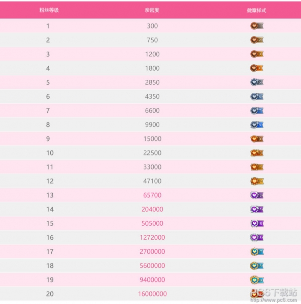 您与艺人的亲密度达到500后自动获得该艺人的粉丝徽章,粉丝徽章共有20个等级。