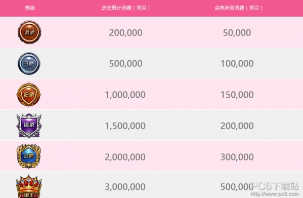用户在平台进行的累积消费达到一定数额后,系统会自动授予用户相应的爵位(每个用户只能同时拥有一个爵位,高级爵位由低级爵位升级而来)。