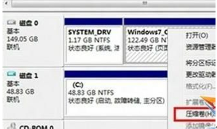2. 右击想要划分的分区,选择“压缩卷” 。