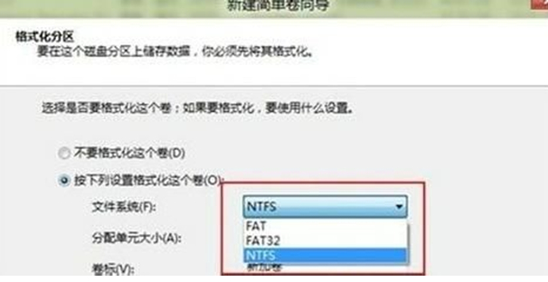7.选择格式化方式,建议使用NTFS格式,点击“下一步”。