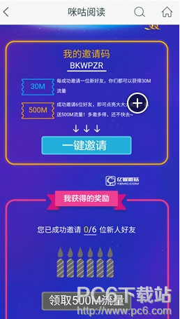2、跳转至“咪咕阅读六周年庆”页面中,你可以看到自己的邀请码,这时你可邀请自己的小伙伴来加入咪咕阅读,加入的小伙伴越多,得到的流量就越多哦: