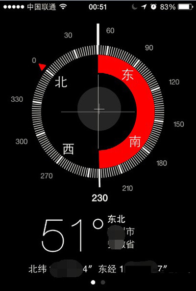 4.完成了【校准】操作后,用户就进入到了指南针界面。在此,用户可以看到自己的经纬度等坐标详细信息哦。