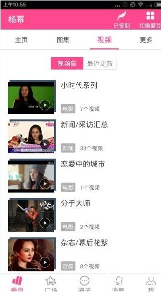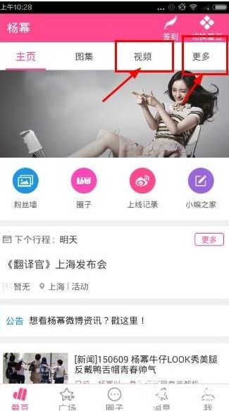 2、在您关注的明星的首页上点击视频或者更多。