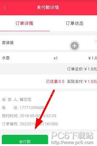1、用户在订单页面,选择付款订单,点击“去付款”,如下图: