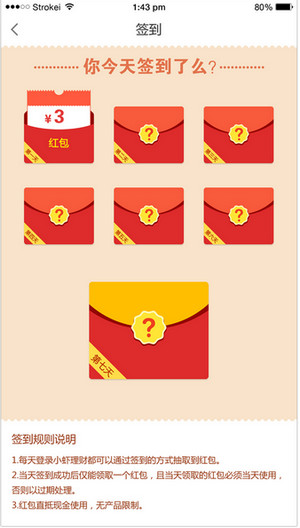 小虾理财每天只能领取一个签到红包,每天签到可以每天领红包哦!