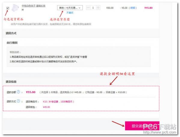 第二步:阅读退货政策,根据您的实际情况选择退货的原因,点击“提交退货申请”:
