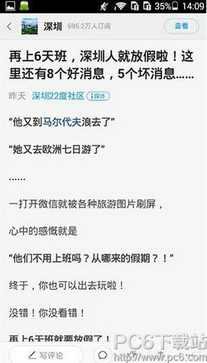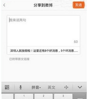 4、此时就进入到新浪微博的正文编辑界面,下面可以看到分享的新闻标题已经链接地址,填写好分享的理由以后点击界面上的发送按钮即可,这样就成功的分享了一点资讯中的新闻。