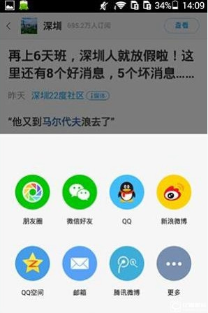 3、此时在界面底部会弹出一个分享窗口,大家可以把这篇好的新闻分享到朋友圈、QQ空间、新浪微博等社交媒体,例如我们以分享到新浪微博为例,点击新浪微博按钮,如下图: