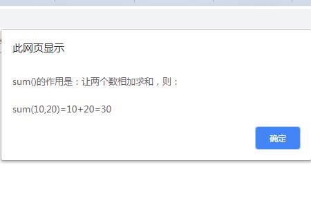 alert("\nsum()的作用是:让两个数相加求和,则:\n\n"+"sum(10,20)=10+20="+sum(10,20));