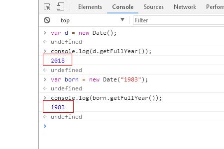 getFullYear() 方法:可以获取当前一个完整的年份(4位数字,1970-????)。例: