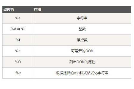 console.log()支持printf的占位符格式输出,支持的占位符有:字符(%s)、整数(%d或%i)、浮点数(%f)和对象(%o):