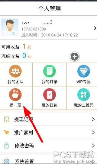 1、打开软件,进入我的个人中心界面,点击提现按钮,