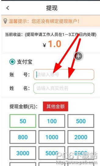 2、进入提现界面,输入支付宝账号,姓名,输入金额点击确定就可以的哟,客服将会在两个工作日内进行提现处理的: