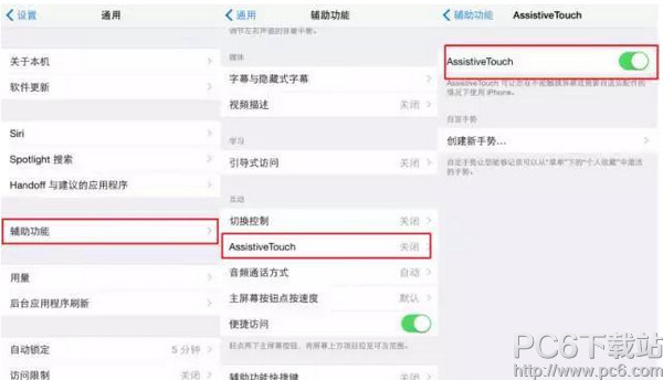 首先,进入【设置】-【通用】-点击【辅助功能】-【Assistive Touch】选择开启,就可以在屏幕中调出小圆点了。这样需要用到按键的功能就都可以通过小圆点来代替实现了。