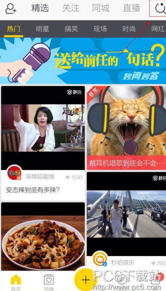 1、找开秒拍直播APP,点击右上角的搜索按钮: