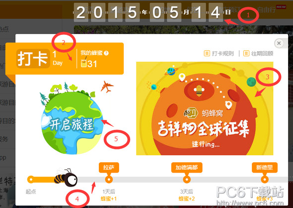 区域5:这里将显示小蜜蜂正在游历的城市,可以点击进入目的地页!