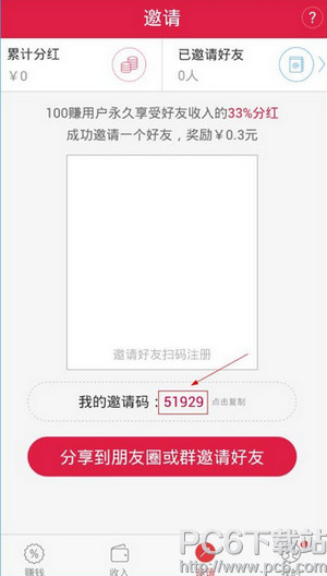 2、在邀请页面中即可查看到自己的邀请码,这里的邀请码为51929,需要的朋友快来填写吧,每成功邀请一名好友将获得1元奖励,此外您还享受好友分享浏览收入的33%永久分红,此分红完全由100赚发放,不会影响好友收入。多邀请好友,收入轻松翻倍。