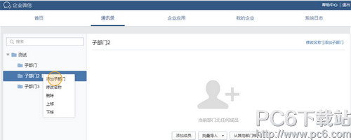 点击“通讯录”的部门旁的三角符号或者在成员列表右上角进行添加子部门。与此同时还提供了修改部门名称、调整部门顺序等操作。