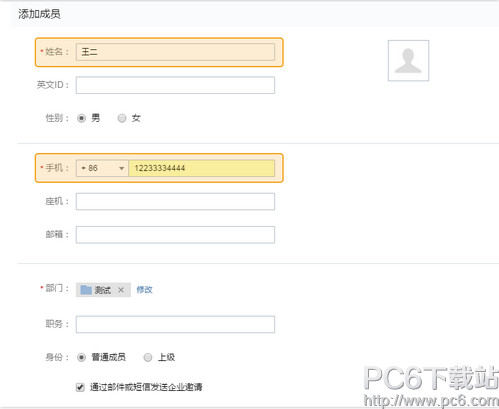 点击“通讯录”-“添加成员”,编辑成员的姓名、英文ID、职务、部门、性别、手机、座机、个人邮箱等信息,其中姓名、手机、部门是必填字段。