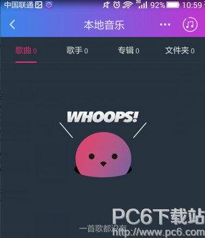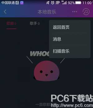 2.进入后显示的一首歌也没有,大家点击右上角音乐符号旁边的“…”弹出一个提示框,里面有选项扫描音乐,点击扫描本地音乐