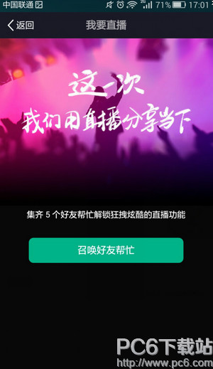 三、进入直播后你会发现想要直播必须要集齐五个好友帮忙才能开启直播功能,大家可以通过QQ、微信,微博等方式帮忙来开启直播功能。