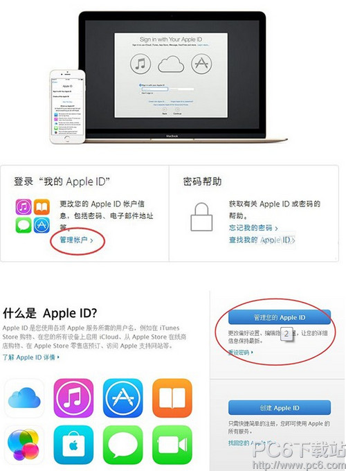 2. 在选择 Apple ID 之后跳转的页面上点击“管理账户”>“管理您的 Apple ID”,输入 Apple ID 和密码之后将进入 Apple ID 管理界面。