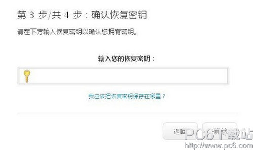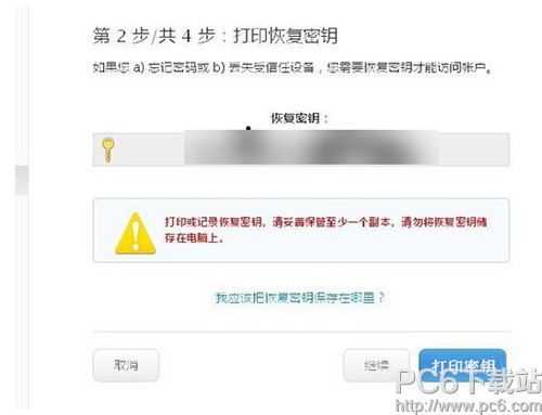 7. 设备验证成功之后,我们会得到一个非常非常重要的恢复密钥,最好将它抄录在一个或者几个不会丢失的本子上,留着以后备用。然后,系统将会要求我们输入恢复密钥以确认我们已经拥有了密钥。